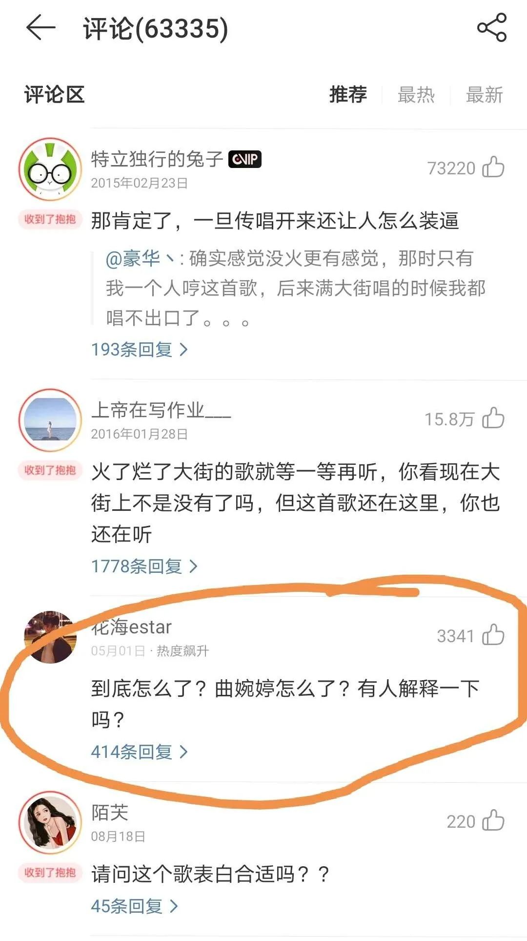 曲婉婷的評論只佔到了《我的歌聲裏》的熱評第11到16名,甚至都沒走出摺疊區。