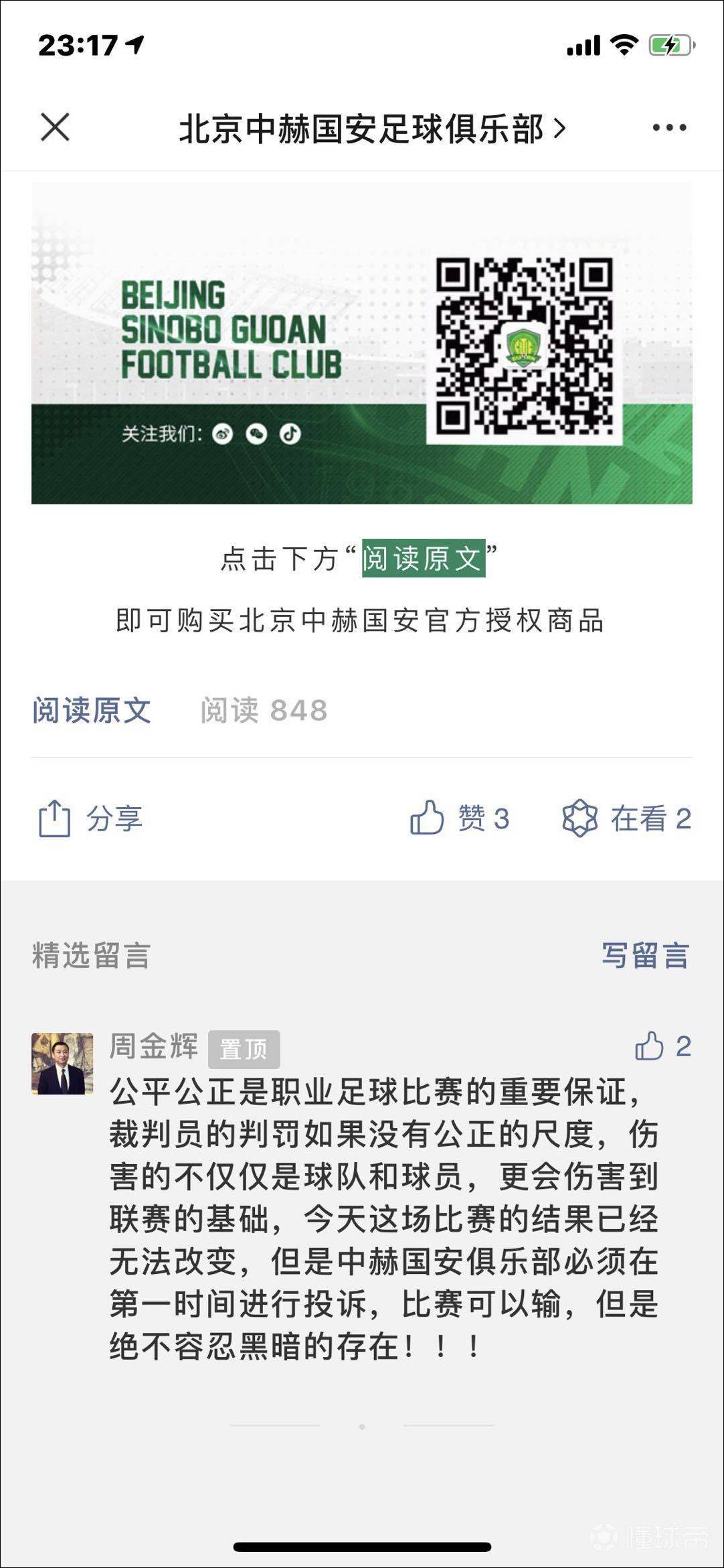北京國安方面已經不止一次公開提出對判罰的不滿。15日與河北華夏幸福3:3打平後,中赫董事長周金輝在官方微信公眾號的留言一度引發軒然大波。