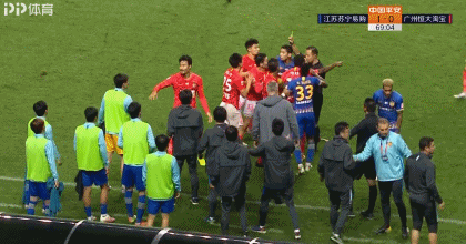 本場比賽最大的爭議發生在70分鐘左右,恒大球員鄧涵文在蘇寧隊的替補席前,將吉祥鏟飛。