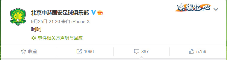 而北京國安官方微博則發了兩個字,“呵呵”。