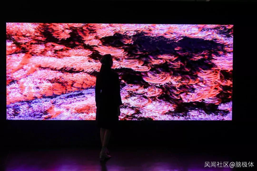不同的物質材料載體會賦予藝術作品不同的感受。比如宣紙與水墨能表現出中國畫的虛實寫意,而油畫顏料與畫布就更趨近寫實主義。而在《非物質/再物質:計算機藝術簡史》的現場,就有許多超出傳統認知的材料,比如一位海外藝術家用LED燈羣組成了一個裝置藝術,控制它時而摧殘如銀河,時而又呈現出賽博朋克的冷酷。