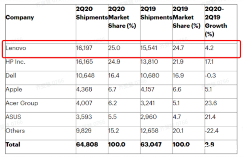 根據Strategy Analytics公佈的數據顯示,經歷了種種風波之後,在蘋果、華為、惠普的圍攻下,聯想筆記本2020年Q2季度的出貨量達到1620萬部,重新回到全球第一的位置。