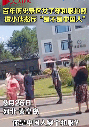 據人民視頻9月27日報道,26日在河北秦皇島一百年曆史景區內,有男遊客上前怒斥兩位身穿和服的女性遊客:“你是中國人穿個和服?”