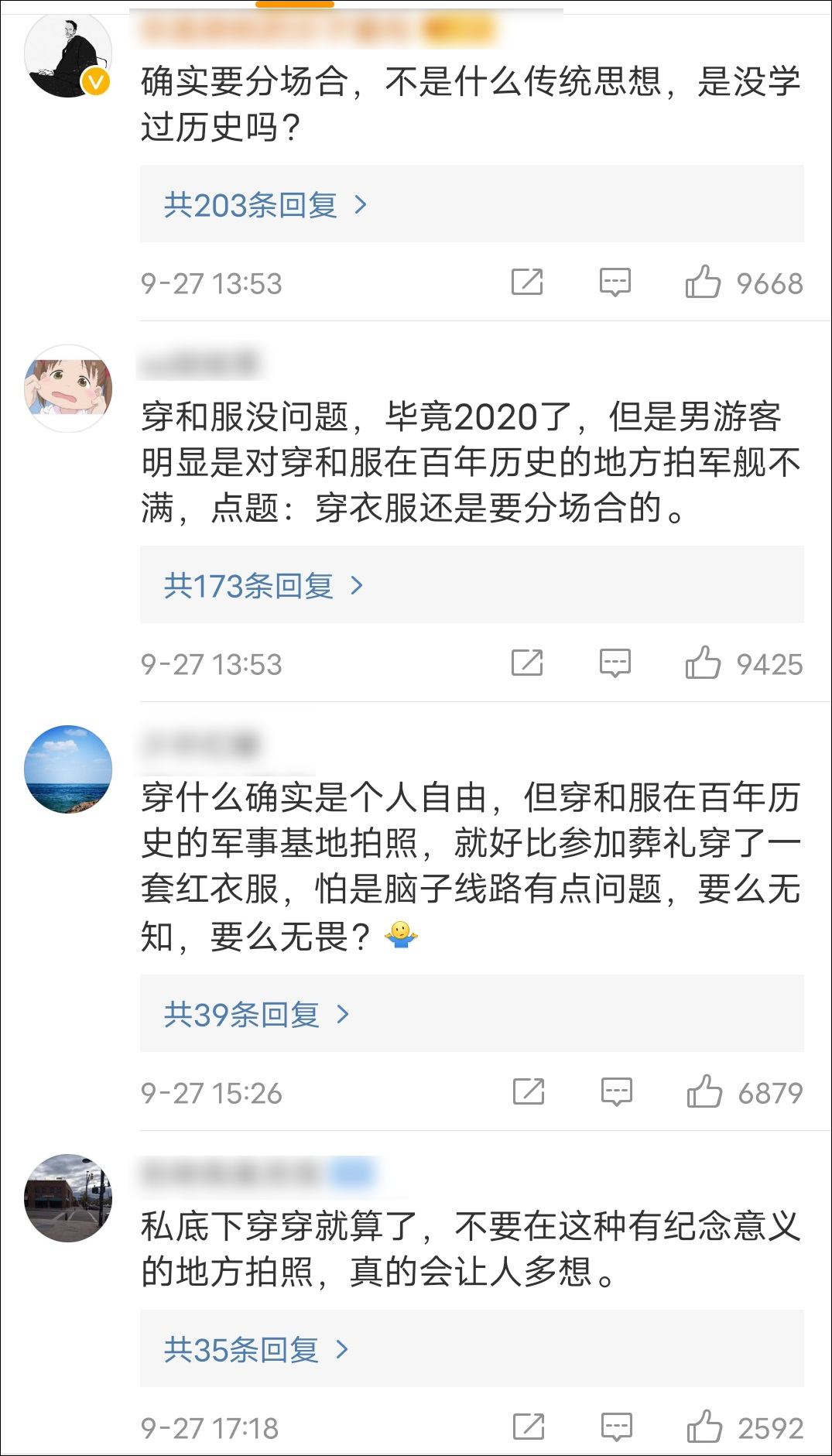 有網友認為事發地只是網紅拍照地,穿什麼拍照的都有。儘管附近確實有軍事管理區,限制拍照,但此事明顯是男遊客故意把軍艦和拍照女遊客聯繫在一起,煽動情緒: