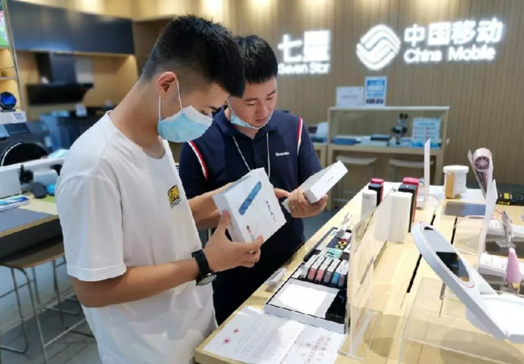 (顧客在七星的3C店裏購買RELX悦刻套裝)