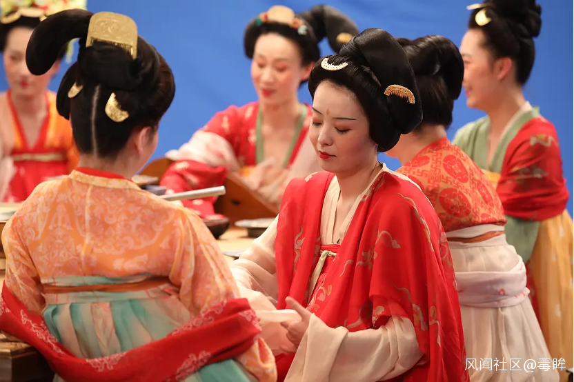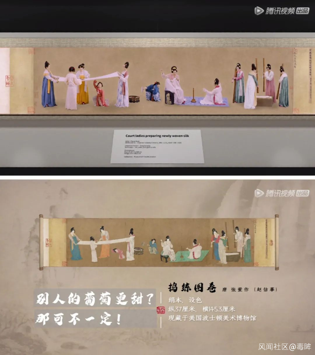 譬如《搗練圖》中女工們吐槽工作勞苦的同時,特意提到韓愈曾説過唐朝晨入夜歸的“考勤制度”不夠合理;仕女們討論家暴新聞時,不忘談起唐代和宋代的和離制度,還提到了房玄齡夫人“吃醋”的典故;《聽琴圖》在兩位大臣進行辯論的過程中,也提起了宋徽宗趙佶是創造瘦金體的一代書法大家的身份……