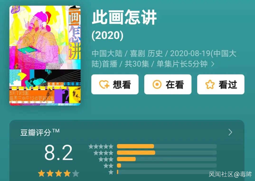 選用情景喜劇模式、詼諧的內容風格的節目的出現,算得上是紀錄片和東方美學風尚在短視頻時代潮流下一種模式與內容上的創新——截至毒眸發稿前夕,《此畫怎講》在豆瓣上已經取得了8.2分的高分。而這種創新的出現,讓更多年輕人有了另一種瞭解傳統文化的可能。