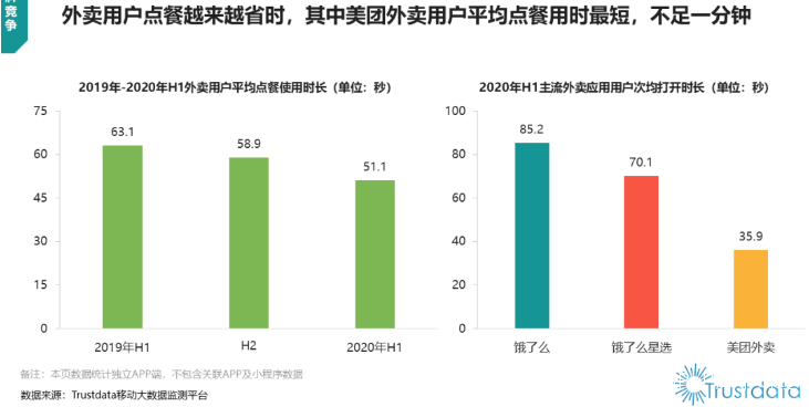 同時,還有一組數據,Trustdata數據顯示,外賣永輝點餐時間越來越省時,2020上半年美團外賣用户的平均點餐時間淨不足1分鐘。