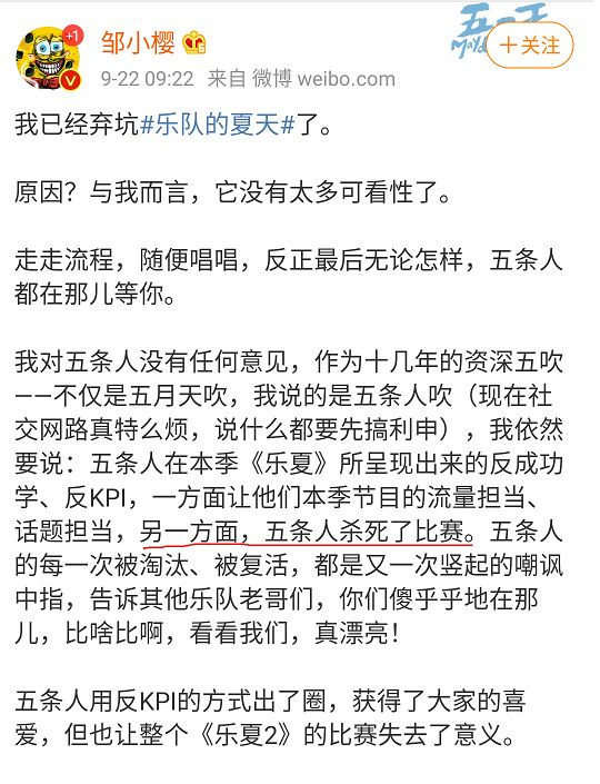 作為安利過五條人的老粉,鄒小櫻老師對五條人的喜愛是毋庸置疑的。但是從他的闡述中,確實讓人感受到五條人的出圈以及綜藝感某種程度上“降維打擊”了其他樂隊,讓樂夏的進程瞬間變得索然無味。