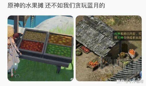 再比如,某位熱心玩家放出了一張遊戲中的水果攤截圖,然後“好心”地和某傳奇品類遊戲進行了對比,發現兩者相差無幾。當然,後來也有其他玩家放出更多優質截圖,表示這是特殊情況。