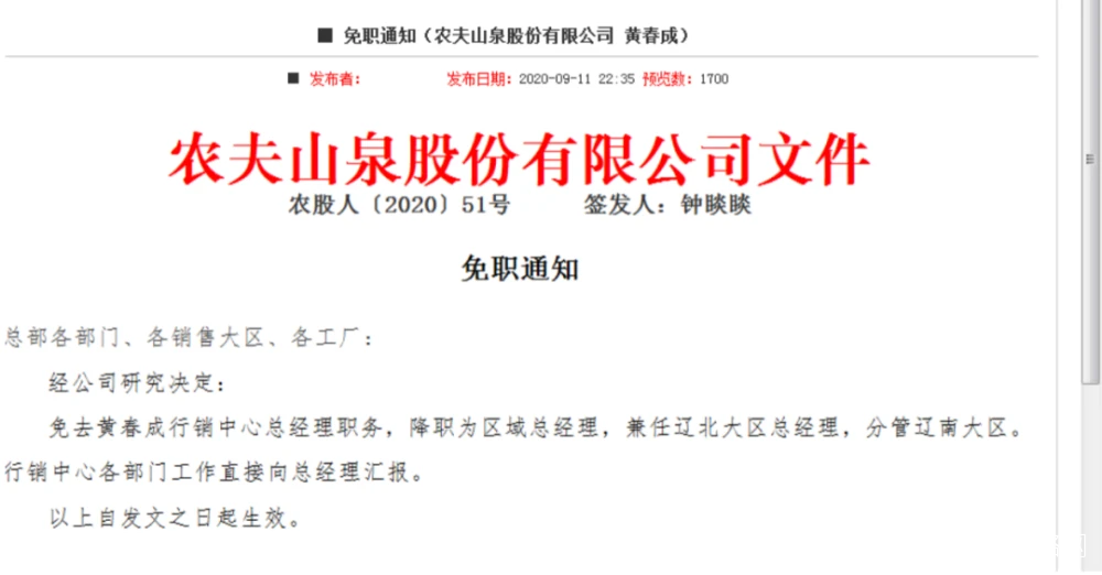 最近一則來自農夫山泉內部的任免單,傳遞出了不一樣的信息。