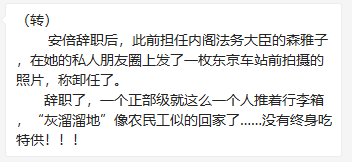 同學羣裏有人轉安倍內閣總辭職後,原法務大臣森雅子發在自己社交媒體上的一張帶着行李,在東京站前的照片。同時轉的還有評語道:“安倍辭職後,此前擔任內閣法務大臣的森雅子,在她的私人朋友圈上發了一枚東京車站前拍攝的照片,稱卸任了。”“辭職了,一個正部級就這麼一個人推着行李箱,‘灰溜溜地’像農民工似的回家了……沒有終身特供!!!”