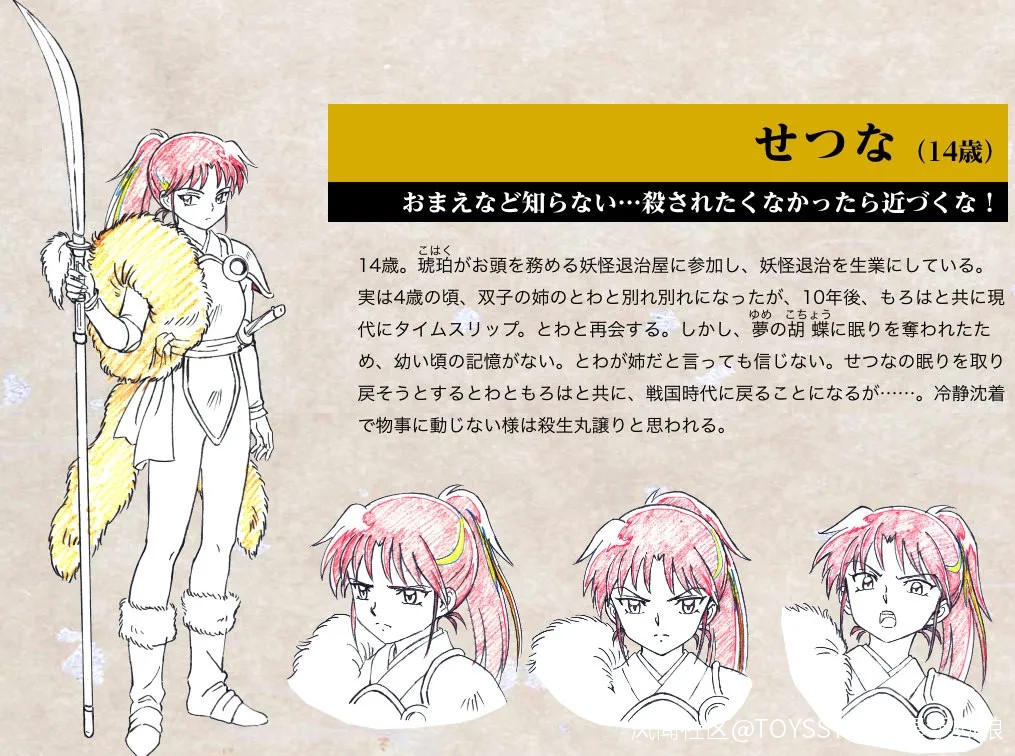 せつな4歲的時候因為山林大火與姐姐とわ失散,目前是琥珀的妖怪退治屋隊員!難道 殺生丸 沒有去找回自己的女兒(還是説幾位上一代主角都遭到不測)。