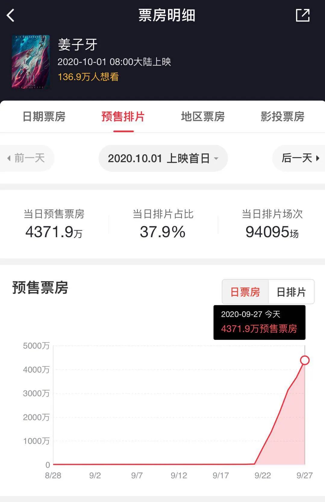 根據貓眼,截至9月27日22時,定檔於10月1日的國產動畫電影《姜子牙》首日預售票房已達4371.9萬元,預售總票房5729.4萬元。