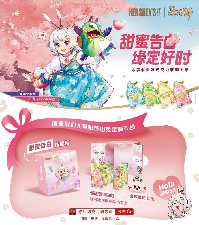 除此之外,陰陽師 IP 也和巧克力品牌好時,在七夕大撒了一波 “ 狗糧 ”。虛擬偶像山兔代言營業,聯名禮盒也瞬間戳中少女心。通過豐富的品牌聯動,陰陽師 IP 打破次元壁來到了日常生活裏,讓 “ 萬物皆可陰陽師 ”。