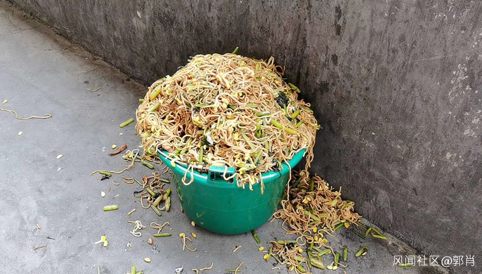 吳校長説,圖片中的麪條為滷麪,學生不喜歡吃麪而把剩下的面倒入桶中,由於塑料桶的體積較小,所以造成麪條溢出的情況。