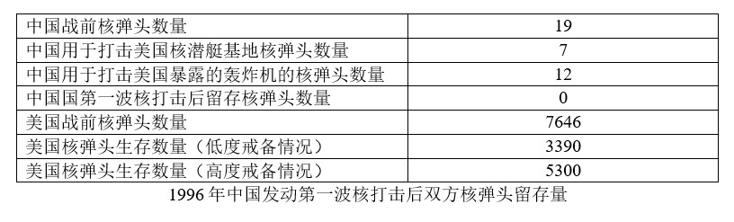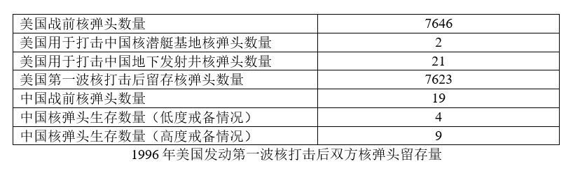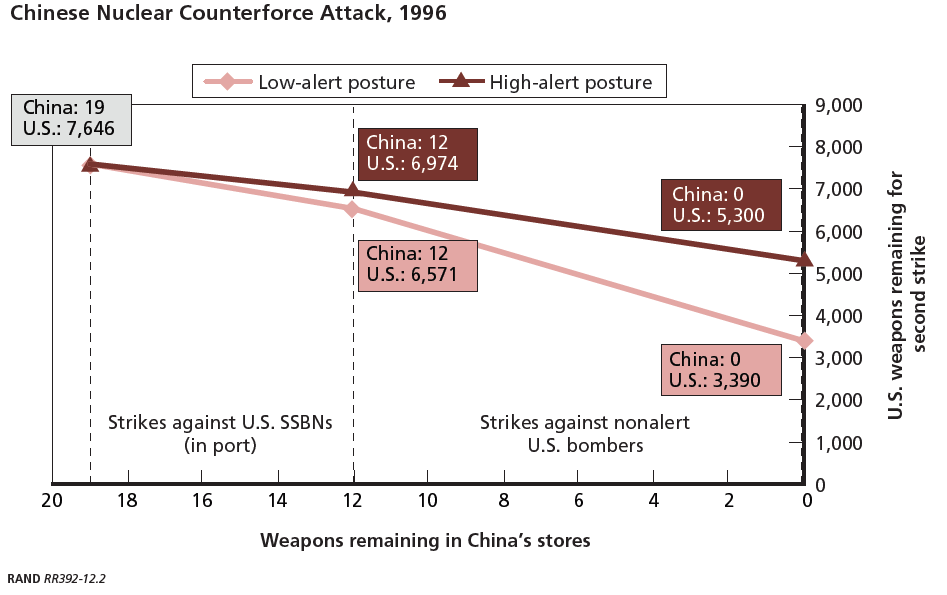 在任何時候,美國核力量都比中國要強大,抗打擊力也更強。在1996年,這個優勢更加明顯。中國在陸上只有河南的7個固定的地下發射井;在海上只有一艘在青島附近蔣各莊的092級戰略導彈核潛艇,按照蘭德報告的説法,需要航行到離目標1700公里才能發射JL-1導彈(JL為“巨浪”的簡稱),而且從來不在海上做例行戰備巡邏,常年停留在港內。由於核力量十分弱小,中國無力發動先發制人的核打擊。另一方面,美國的核彈頭和發射工具在數量和質量上都佔絕對優勢,是有可能通過先發制人的核打擊一舉摧毀中國核力量的。