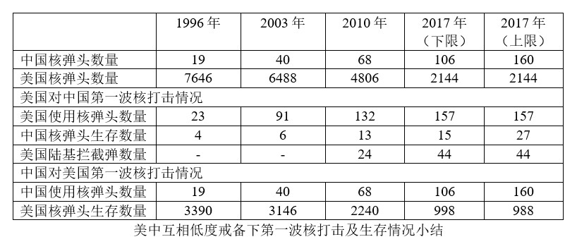 中國發動第一波核打擊的能力有所加強。假定美國處於低度戒備狀態,有可能摧毀3342枚美國核彈頭,約佔52%。這比1996年情況還要少,這是因為更多美國核彈頭轉移到核潛艇上,抗打擊力大大提高。另外,更多美國核導彈根據核裁軍條約規定改為單彈頭,減少了中國核打擊一次摧毀的美國核彈頭數量。美國方面依然有3146枚核彈頭留下,足夠滿足任何核反擊的需要。