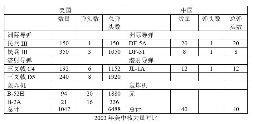 到2003年,中國核力量的DF-5數量得到擴充,而且開始裝備機動發射的DF-31(射程8000公里)。DF-31需要機動到東北,才能通過北極上空攻擊美國境內的目標。潛射的JL-1A在JL-1基礎上改進而來,提高了射程、精度和當量。在美國方面,不僅核彈頭數量在限制戰略核武器條約的約束下繼續減少,民兵II導彈全部退役,150枚民兵III導彈從三彈頭改為單彈頭,B-1B也退出核打擊序列,全部作為常規轟炸機使用。B-2A數量增加了15架(但有一架墜毀),另外還增加了42枚三叉戟D5潛射導彈。美國總計減少了1000多枚核彈頭,但發射平台只減少43個,還是對中國佔壓倒優勢。