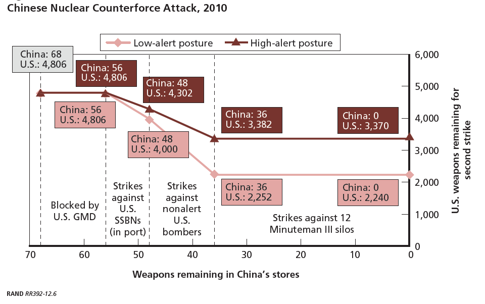 由於中國核導彈的數量增加和新增的機動發射能力,美國要以80%的置信度摧毀全部中國核力量需要 91個核彈頭,這依然只是1.4%的美國核彈頭總數。假定中國處於低度戒備狀態,美國第一波核打擊之後,中國還能有6枚核彈頭留下。唯一的094的抗打擊力依然成問題,“流竄在外”的機動發射的DF-31是一個問題,但數量有限。如果中國提高到高度戒備狀態,散開部署的DF-31增加,但數量還是有限。美國核力量依然對中國佔有絕對優勢。