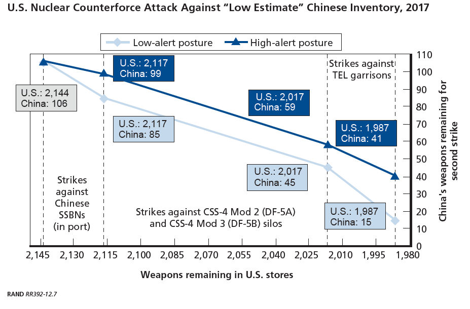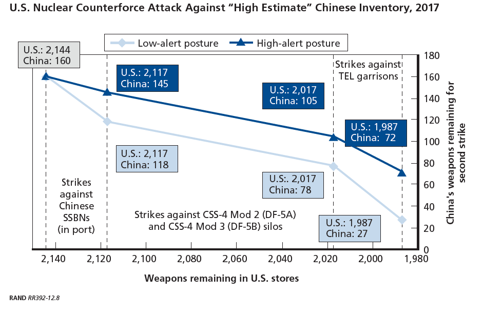 依然假定中國只處於低度戒備,美國以80%置信度發動第一波核打擊摧毀全部中國核力量需要157個核彈頭,約佔7%的美國核武庫。使用中國方面彈頭數量估計下限的情況的話,中國將有15枚核彈頭生存下來。顯然,中國核力量的抗打擊力在逐年提高,但並沒有提高到足以翻盤的地步,尤其考慮到美國的陸基攔截彈數量也在增長。另一方面,中國具有5艘094級核潛艇和36枚機動發射的洲際導彈,低度戒備狀態也可能與以往有所不同,有更多的核力量處於戰備狀態。使用彈頭數量估計上限的話,中國將有多達27枚核彈頭生存下來,比下限情況多12枚。這是更有把握的核反擊力量。尤其是中國有更多的094級核潛艇,可以從繞開阿拉斯加的陸基攔截彈的陣位發射導彈,使美國更難防備。這也是中國特別煩在南海亞龍潛艇基地附近轉悠的裝備SURTASS拖曳聲納的美國海軍水深監測船的緣故,這些船在蒐集094的水聲特徵,為反潛戰做準備。不過多彈頭的DF-5B對於提高中國核力量抗打擊力沒有多少幫助,固定的地下發射井總是易受打擊。這對美國也一樣,但相對於中國核彈頭數量,美國的地下發射井數量大得多。