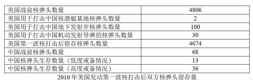 在2010年,中國核力量依然不足以在第一波核打擊中全殲美國核力量。如果DF-5A用於打擊面目標(如核潛艇基地、轟炸機基地),其他更精確的導彈用於攻擊發射井,中國的第一波核打擊有望摧毀2566枚美國核彈頭,約佔53%,還有2240枚核彈頭留下。