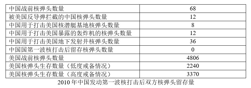 對於中國發動第一波核打擊的情況,假定彈頭數量為估計下限,中國可摧毀1146枚美國核彈頭,約佔53%。DF-5A將集中打擊基查普和國王灣潛艇基地,惠特曼(B-2)、巴克斯代爾和麥諾特空軍基地(B-52)。如果美國空軍把剩下不多的B-52統統集中到巴克斯代爾或者麥諾特,而不是分居兩地,中國還可以節約幾個核彈頭,用於民兵III發射井。但由於民兵III發射井數量眾多,節約下來的幾個核彈頭不能實質性改變結果,美國依然有至少近千核彈頭留存下來,足夠發動任何規模的核反擊,核優勢不變。