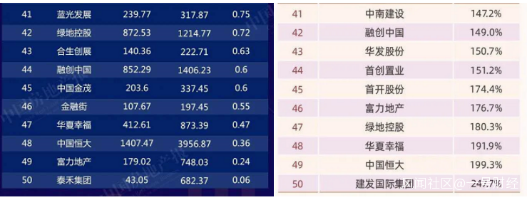 其中,現金短債比在TOP50房企中位列倒數第3,僅好於華夏幸福和富力地產,淨負債率在TOP50房企中位列倒數第2,僅好於建發集團的247.7%(數據和行業排名來源為新浪財經、中國房地產報、國際金融報及億翰智庫)