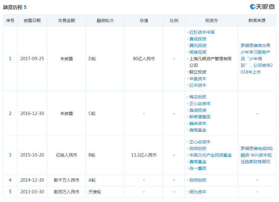 值得注意的是,在羅輯思維和得到APP崛起的過程中,資本的力量無處不在。天眼查顯示,思維造物此前共獲得了5輪外部融資,投資方包括順為、啓明創投、紅杉、真格基金、華興資本、中國文化產業投資基金等眾多知名投資機構。