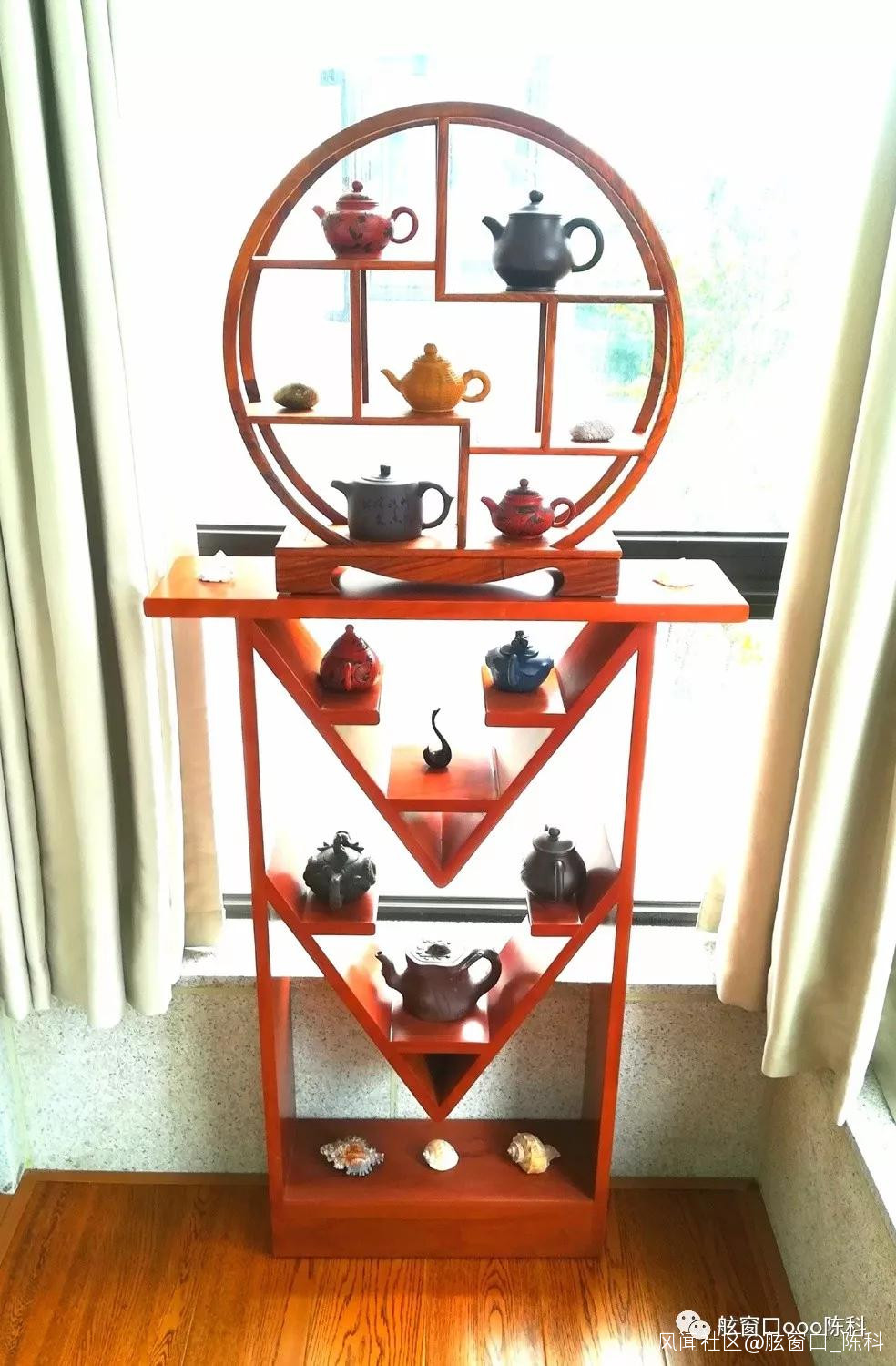 陽台東首:上面的“圓形壺架”(直徑50cm,寬近13cm)是網購的,價格305元,説是緬甸雞翅木(當然,更多是採用小料和邊料流水加工),自感性價比還是挺好的。下面的“T型壺架”是自己設計後請當地的傢俱廠製做的,用的是櫻桃木。
