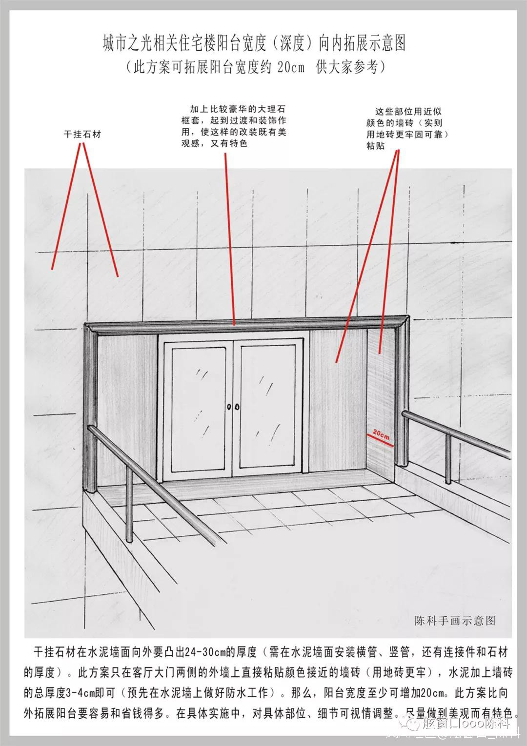 我們小區住宅還在建造時,很多鄰居就説陽台太窄了。當時(2017.9)我搞了以上這個設計方案圖發在羣裏,即:在陽台牆面(陽台移門兩側及上方的牆面)拿掉幹掛石材(含鋼架),直接貼牆磚,這樣可以減少牆的厚度20多釐米,從而增加陽台面積。 收房(2018.10起交付)後,確有不少鄰居把南陽台牆上的幹掛拿掉,換上牆磚等。本人測算了一下,如把咱家南陽台牆上幹掛換成牆磚,可增加陽台面積約0.5個平方,後因怕麻煩及成本等因素,最終未換掉幹掛。