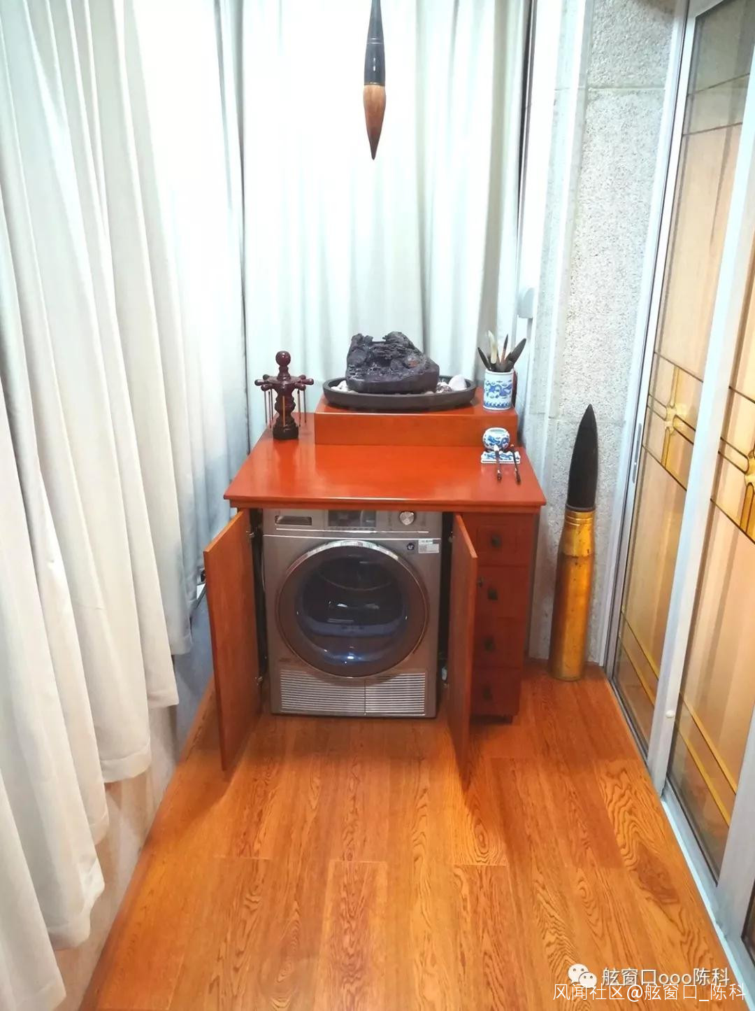 書寫台下藏置烘乾機,烘乾機上的排水管與下水管道連接。烘乾機用得不多。其實烘乾機亦可置於滾筒洗衣機上,而我們選擇了桶式洗衣機,是可以少彎腰,因腰椎等不太好,而洗衣機使用頻次高。