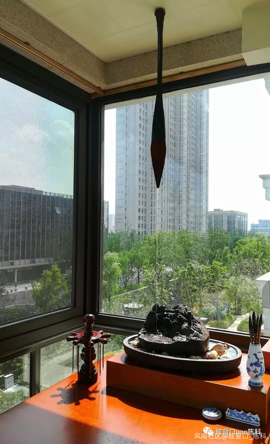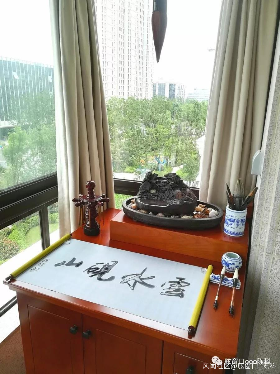 曾在線上線下尋找端硯、歙硯等兩個多月,最終在網上找到一方比較合適的肇慶端硯,置於鬥筆下方;硯台“山間”綴一小煙墨;硯台配置山水底盆……《 陽台山水實景圖 》就此“造”成。閒來無事,漫步陽台,觀賞“雲水硯山”,暢想瀑水峻山,方能自得其樂……