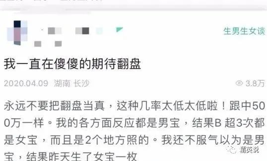有網友即使B超做過3次,鑑定為女孩,依舊堅定不移地覺得自己懷的是男孩,直到女兒降生,發文感慨“翻盤失敗”,行文中充滿了遺憾和失望。