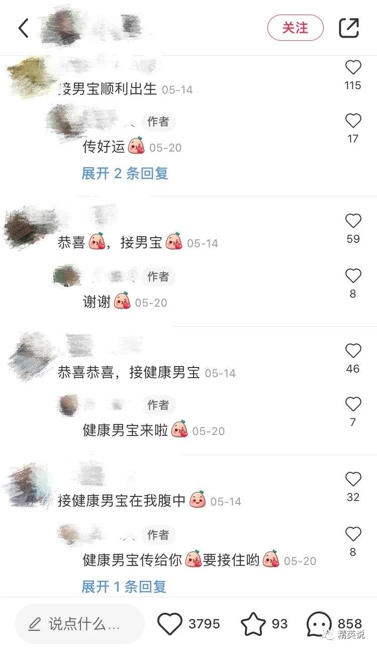 不僅僅是小紅書,包括抖音,以及各種孕期APP上,“求男胎”、“女翻男轉好運”的帖子層出不窮,且熱度頗高。