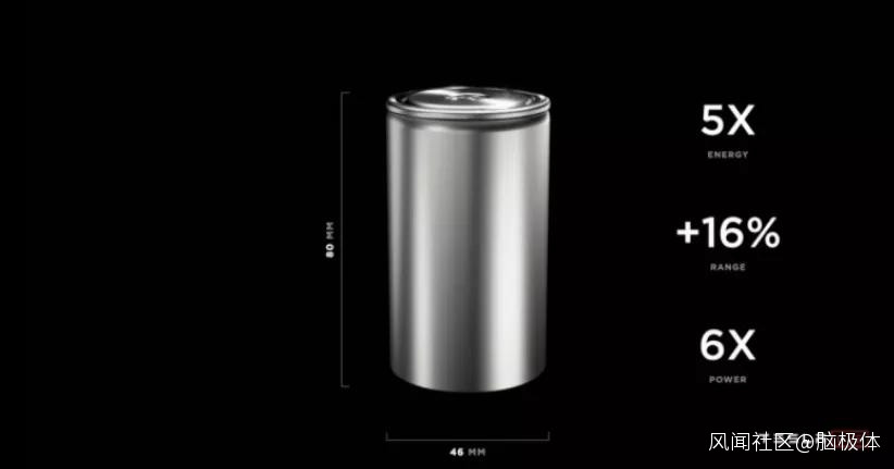 電池日的“重磅”發佈是4680大尺寸電池。直觀來説就是特斯拉單位電池的尺寸結構的升級,從原來的21*70mm升級到46*80mm,體積的變大直接使得電芯容量較之前增加5倍,增加16%的續航,功率提升了6倍。