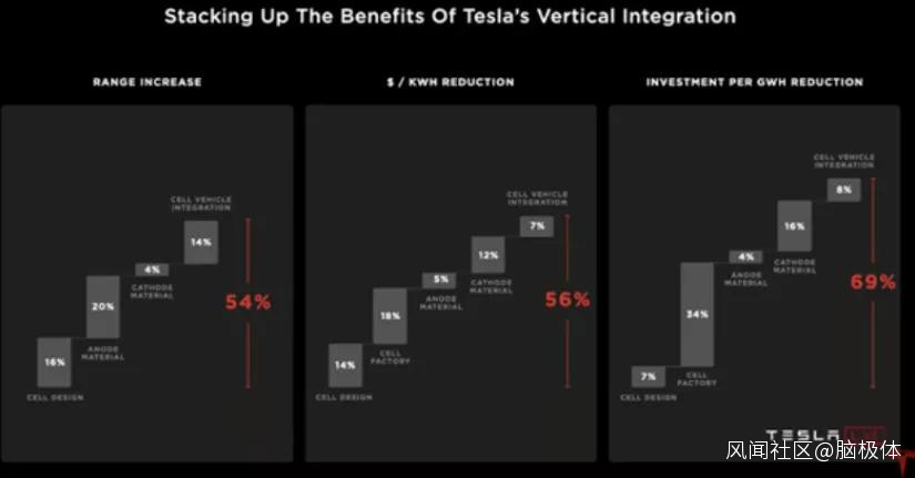 綜合這些技術的應用,新電芯能夠讓電動車的續航提升54%,每千瓦時電池價格下降56%,生產成本降低69%。