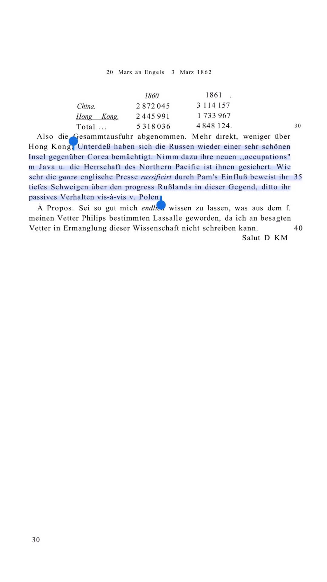 Indem Brief an Dich war Japan für Java gelesen. Die facts selbst habeich aus verschiedenen Nummern der Tribune, die officielle russischeBerichte u. Berichte v. amerik. Consuln brachte - alle unterdrücktin der englischen Presse. Die Nummern selbst habe ich U r q u h a r tzugeschickt u. noch nicht zurückerhalten. Ich hatte sie vorherbenuzt zu einem article in der Presse über den Fortschritt derRussen in Asien. Die Esel haben das jedoch nicht gedruckt. Nun kennstDu mein schlechtes Namensgedächtniß. Ich kann Dir alsoaugenblicklich die Namen nicht nennen. Die erste Insel liegt grade inder Mitte zwischen dem südwestlichen Ende v. Japan u. dem Festlandvon Corea. Sie besitzt grossen Hafen, nach dem amerik. Berichtfähig, ein Sebastopol N. II zu werden. Was die andern direkt zuJapan gehörigen Inseln betrifft, so befindet sich, wenn ich nichtirre, Jeso darunter. Ich werde jedoch sehn, daß ich die Dokumentewieder bekomme.【5】