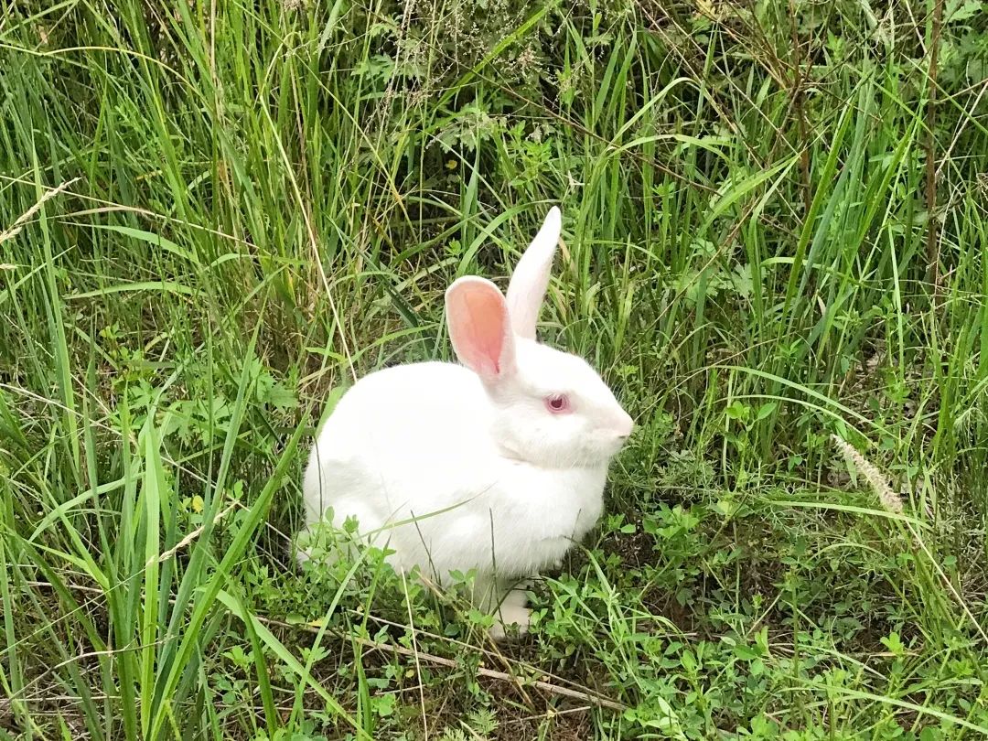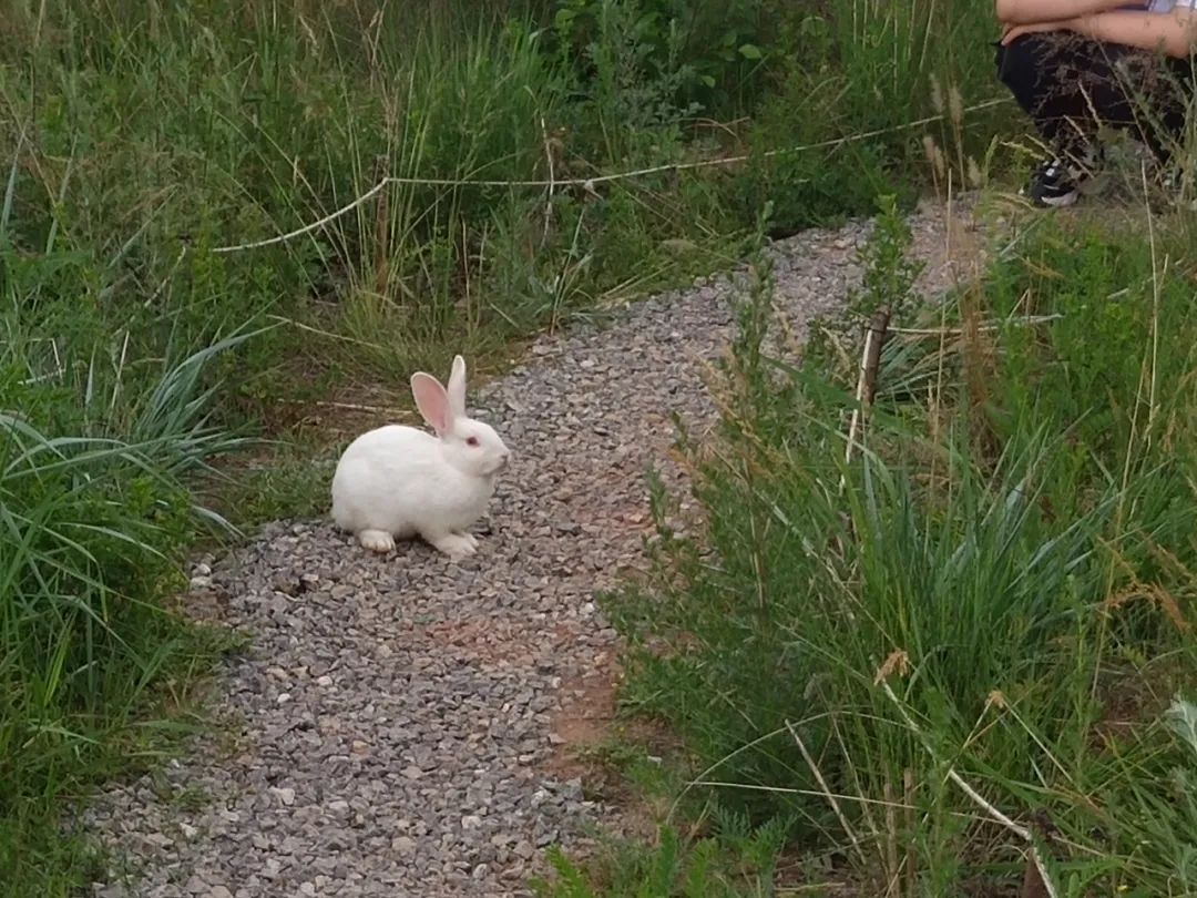 那是一隻雪白雪白的兔兔,幾個月前,它被我們買來給基地救助的雕鴞進行野化訓練,然而,會縮骨功的它從鐵絲網的縫隙中逃了出來。