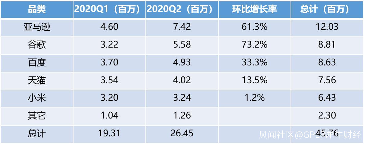 從智能音箱的市場表現來看,智能音箱已經進入了大批量生產的時期。根據市場調研機構奧維雲網發佈的《2020年上半年中國智能音箱市場總結報告》,上半年中國智能音箱市場的銷量為1908.6萬台,同比增長22.7%,並預計2020年全年的銷量有望達到4260萬台,同比增長約為15.7%。這從某種程度上意味着,智能音箱市場有了盈利的底氣,小度的自我造血能力也將有力吸引相關資本的注入。