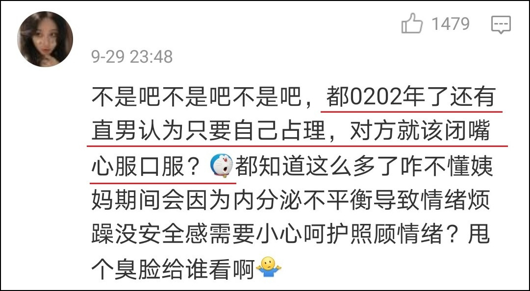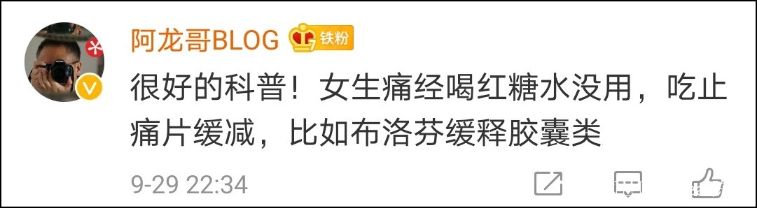 她還指出,“緩解經期疼痛,紅糖水沒用,布洛芬有用”,這樣的話語憑什麼是通過男方之口講出來。而且每個女性在經期之間的感受都不一樣,“覺得喝紅糖水有用就喝,吃止痛藥有用就吃”,這並不是非黑即白的事情。