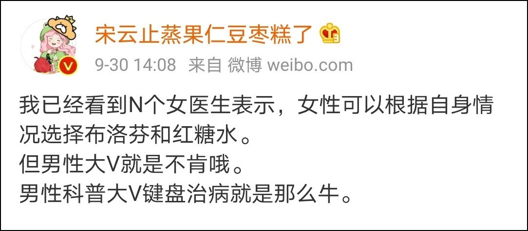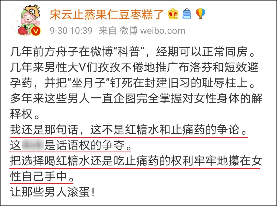 她特別提到,過去幾年時間裏,男性大V們在孜孜不倦地推廣着布洛芬和短效避孕藥,“這些男人一直企圖完全掌握對於女性身體的解釋權”。有基於此,女性朋友要把選擇喝紅糖水還是吃止痛藥的權利牢牢地攥在自己手中。