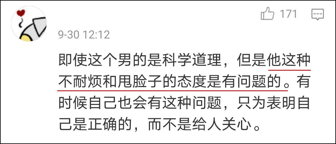 有網友指出,即使男方説的話有道理,但是“他這種不耐煩和甩臉子的態度是有問題的”。