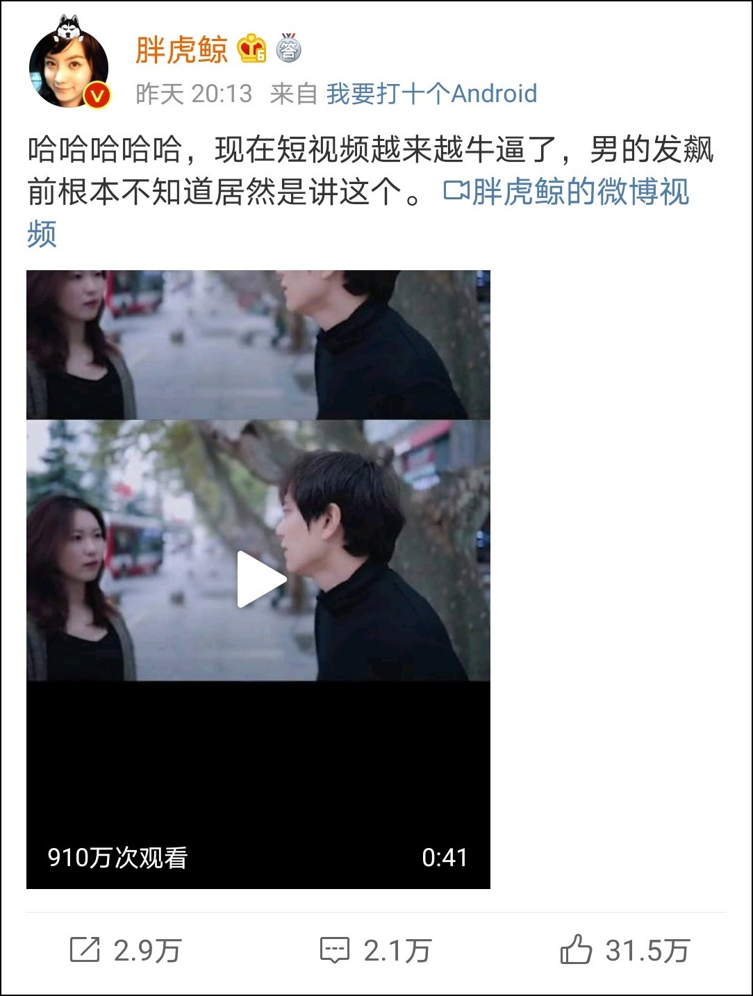 29日晚,大V@胖虎鯨 將視頻分享到微博後,意外地讓這則視頻火了。