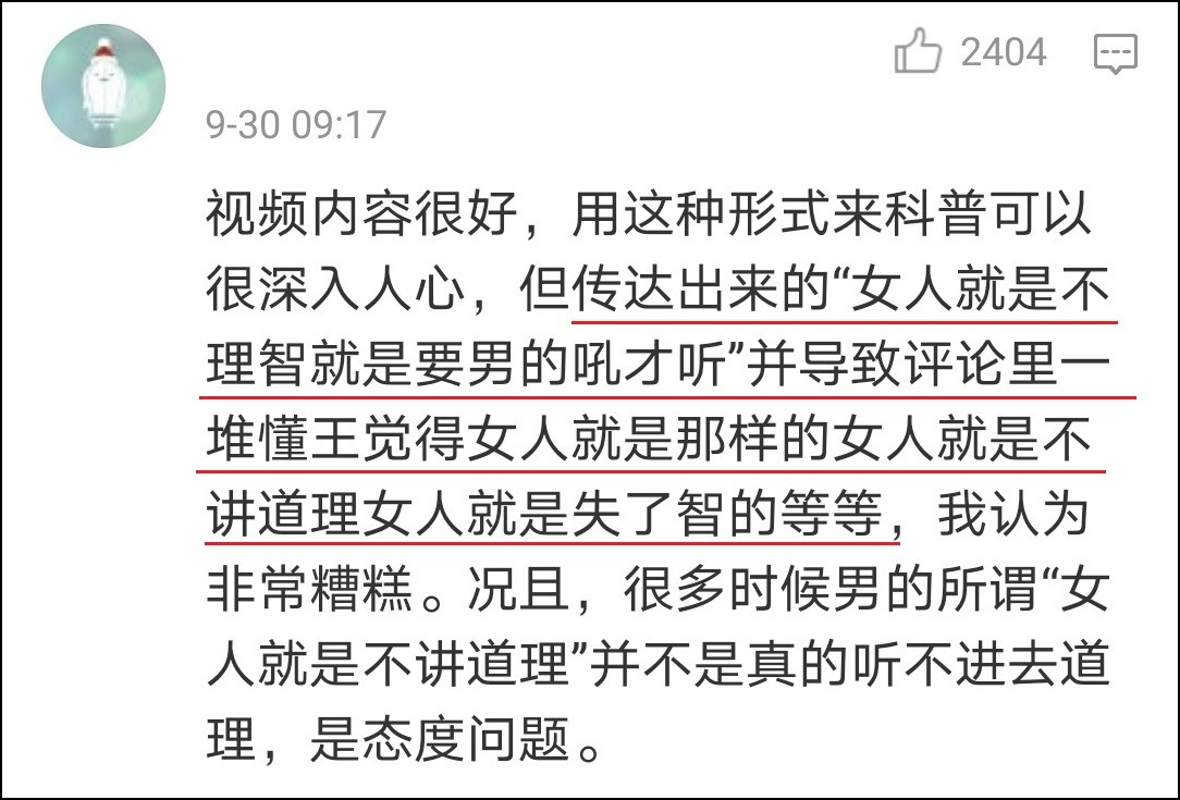 還有網友表示,視頻無意間傳達出了“女人就是不理智,就是要男的吼才會聽”的觀點,對於女性羣體而言是一種歧視。