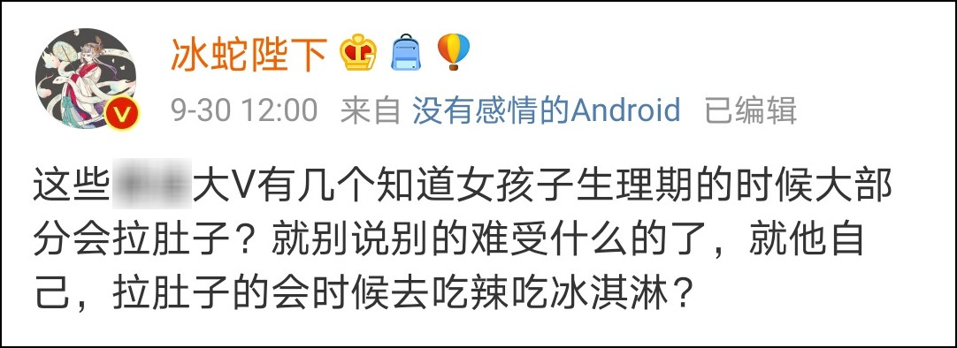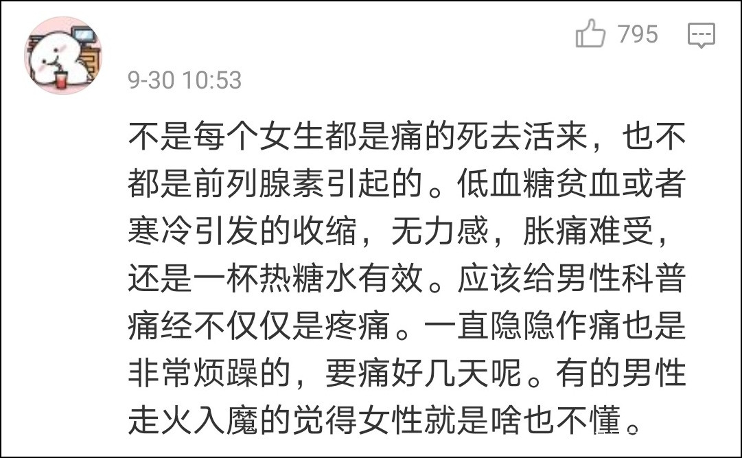 尤其是,很多大V並不懂得女性在經期裏遭遇到的並不只是疼痛,而是四肢無力、心情煩躁、身體出虛汗、拉肚子等一系列症狀。