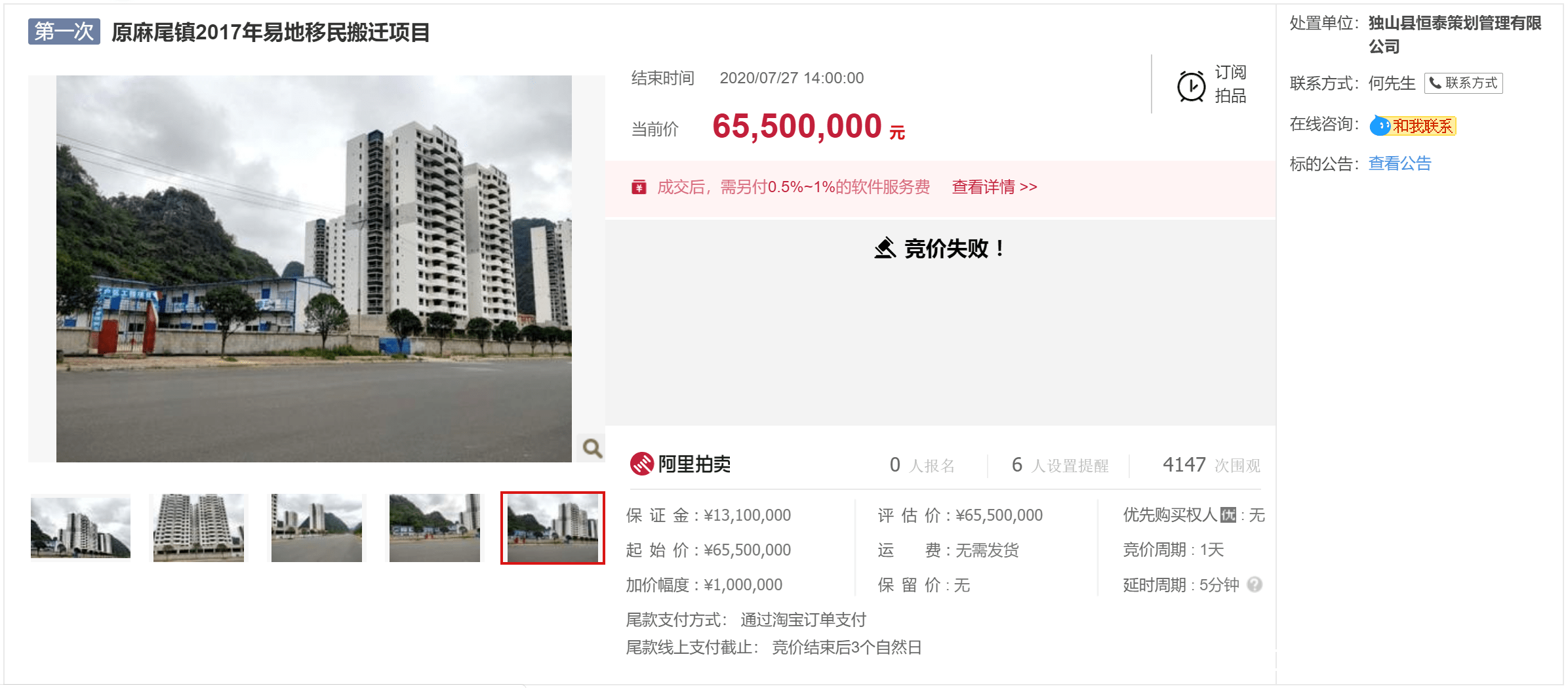 《每日經濟新聞》記者注意到,獨山縣麻尾鎮政府曾在今年7月份將易地移民搬遷項目放到阿里拍賣上公開處置。當時,項目的起拍價正是6550萬元。不過,這場競拍無人報名,以失敗告終。