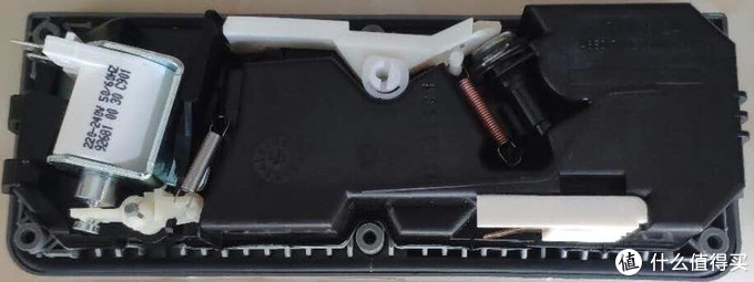 一側有個電磁鐵,通過一系列的槓桿和復位彈簧,可以拉動一個卡扣,能把被扭力彈簧頂着的洗碗粉盒蓋打開;同時還串聯了一個小的活塞泵,能把光亮劑分配盒裏的液體泵出去,這玩意裏面不管卡死沒卡死,實際對整個洗碗機的開機沒有任何影響。