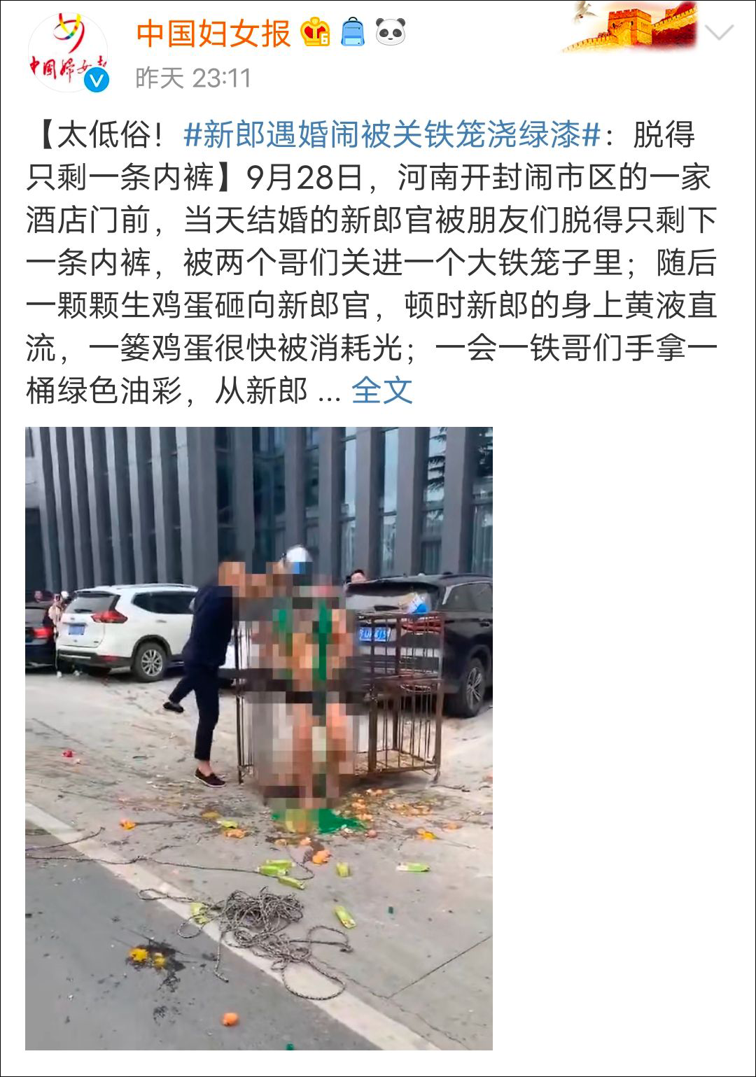鬧市中又現低俗婚鬧:新郎被關鐵籠、扔雞蛋、潑綠漆_風聞