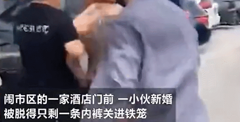 據瀟湘晨報的視頻顯示,9月28日,在河南開封鬧市區的一家酒店門前,一名新郎被扒光了衣服,由兩名男子挾持着,關進了一間鐵籠子。途中還有一名男子,朝新郎臀部踹了一腳。